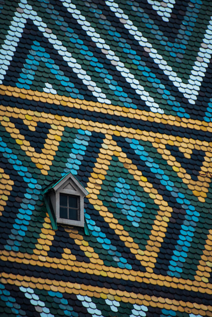This photo of the Stephansdom roof was taken in August 2023 in Vienna. The juxtaposition of architectural styles creates a captivating scene that highlights the cathedral’s unique character and charm.