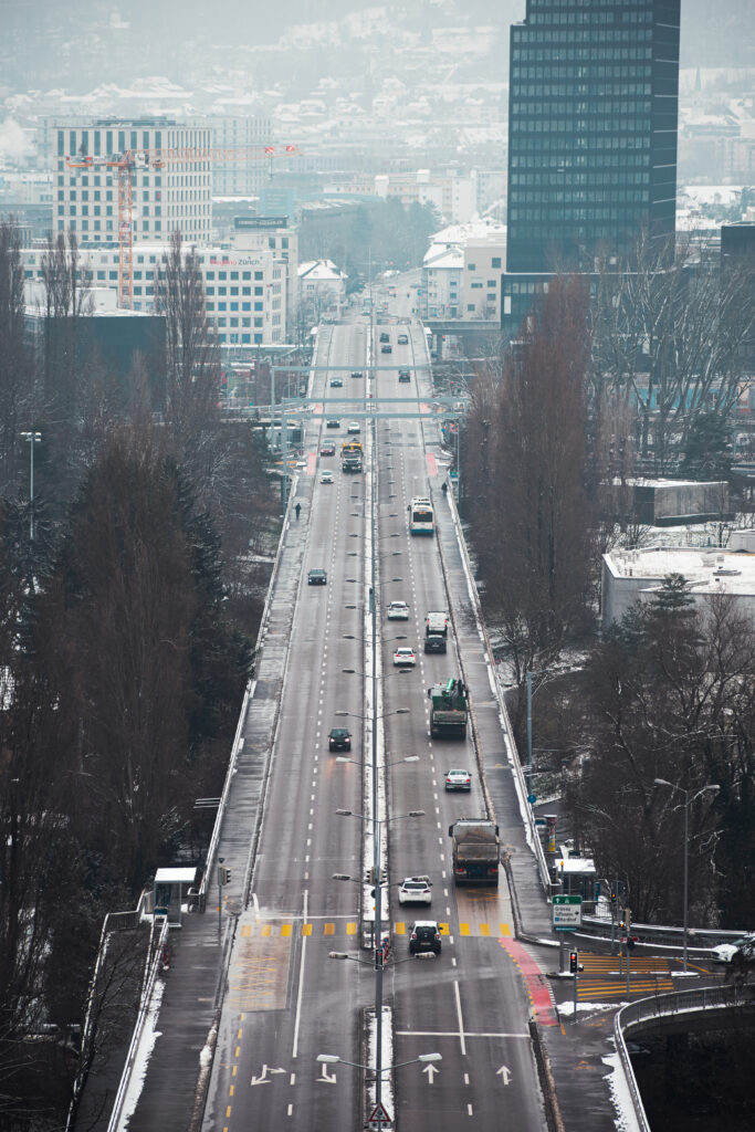 This photo of the Europabrücke was taken in January 2024 from the viewing platform near Kirche Höngg. Accessing the platform presented its own challenges as the rain made the stone road leading to it quite slippery.